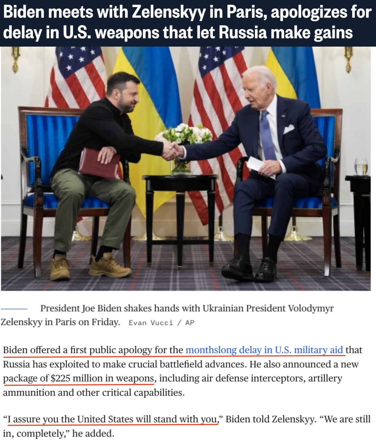 在巴黎會見烏克蘭總統(tǒng)澤連斯基時(shí),拜登首次就美國國會未能更早通過對烏新援助法案“道歉”,并宣布將再向?yàn)蹩颂m提供2.25億美元援助。