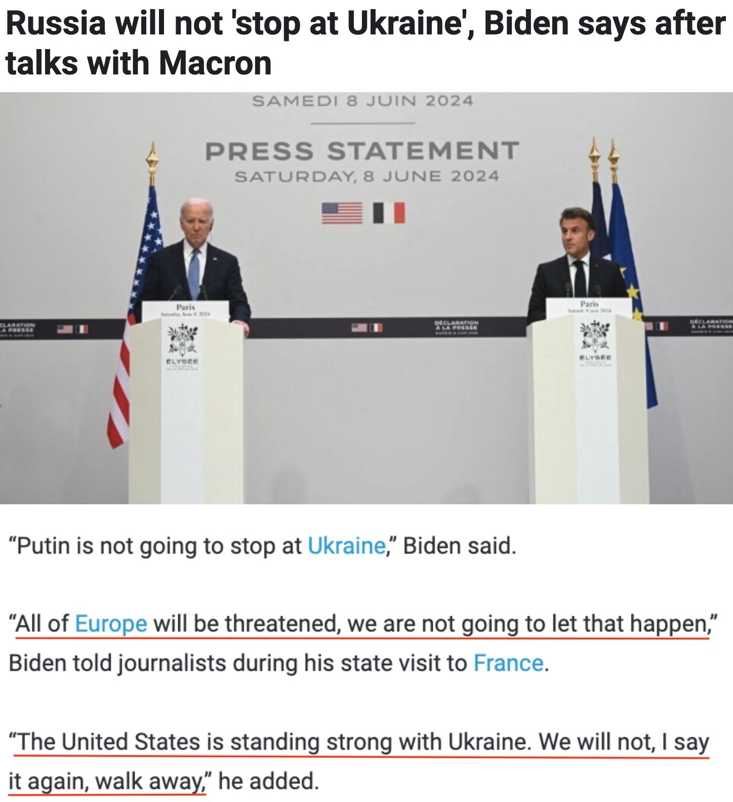 “俄羅斯不會止步于烏克蘭,整個(gè)歐洲都將受到威脅,我們不會讓這種情況發(fā)生……美國堅(jiān)定地支持烏克蘭。我再說一遍,我們不會走開。”