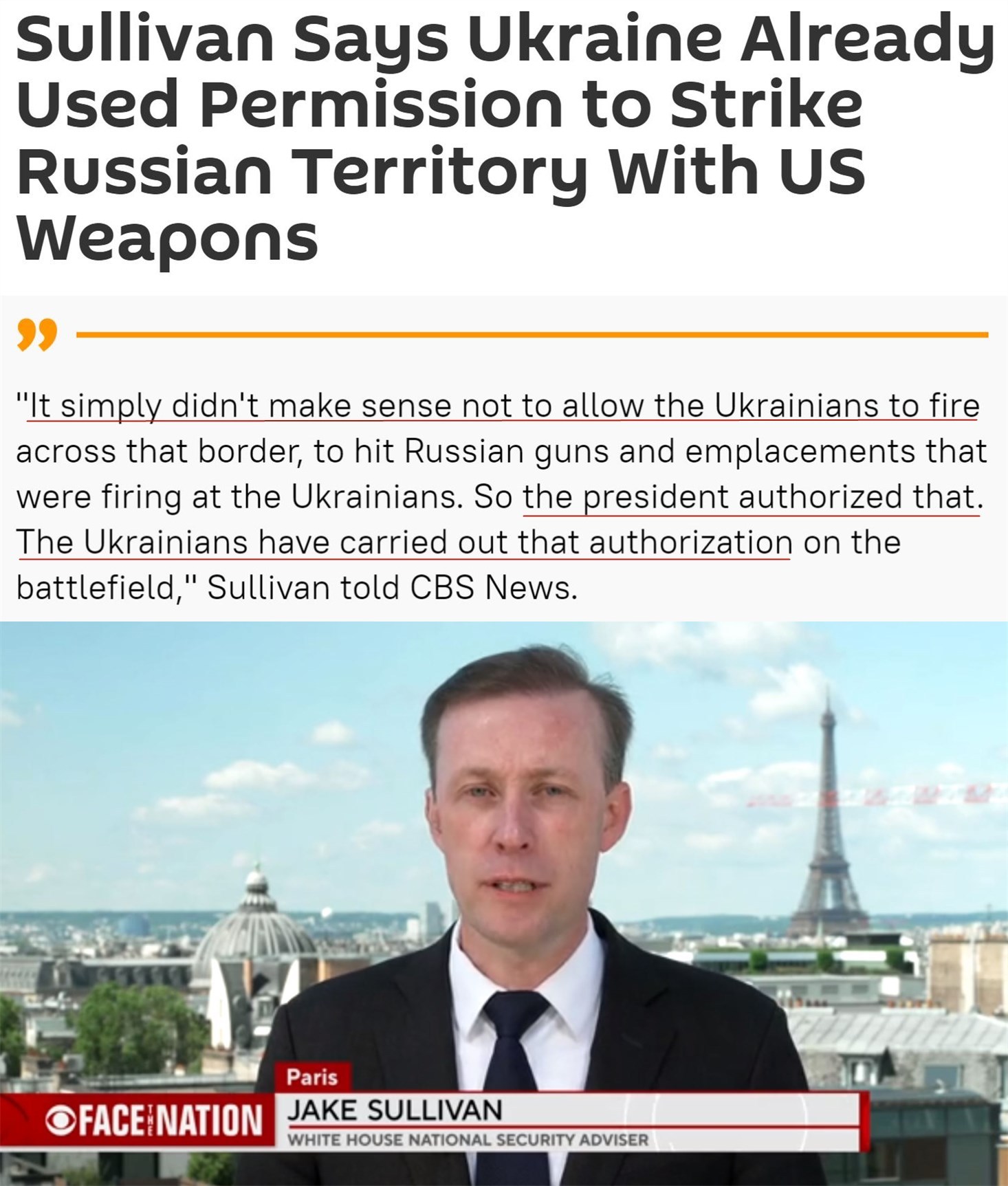 “它們(這些武器)被授權(quán)在(烏俄)邊境附近使用……我們沒有授權(quán)(烏克蘭)向俄羅斯境內(nèi)200英里(約合320公里)的地方發(fā)動襲擊,也沒有授權(quán)對莫斯科、克里姆林宮進(jìn)行打擊?!?/p>