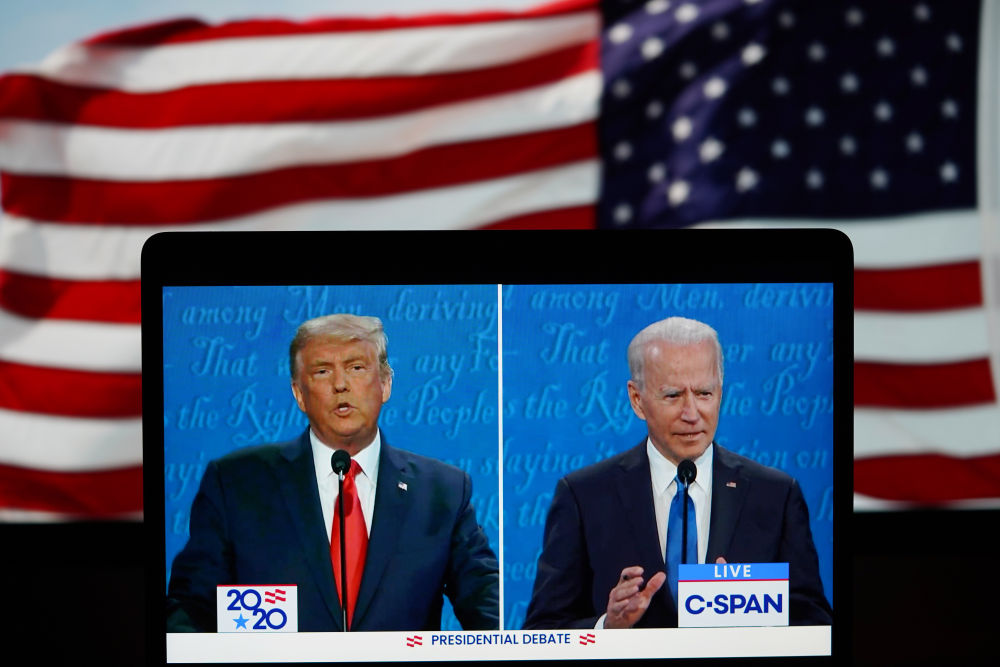 這張2020年10月22日在美國弗吉尼亞州阿靈頓拍攝的視頻畫面顯示,時(shí)任美國總統(tǒng)特朗普(左)與民主黨總統(tǒng)候選人拜登在田納西州納什維爾市參加最后一場(chǎng)總統(tǒng)候選人電視辯論。新華社記者劉杰攝