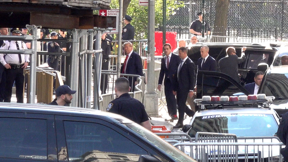 這張4月15日的視頻截圖顯示,美國前總統(tǒng)特朗普抵達(dá)紐約曼哈頓一家刑事法院出庭,出席關(guān)于其在2016年涉嫌偽造商業(yè)記錄以掩蓋向一名女演員支付“封口費(fèi)”一案的審理。新華社記者丁曄攝