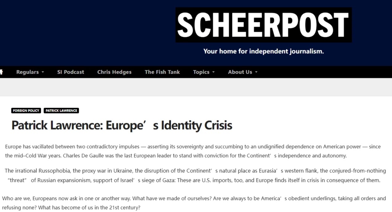 美國(guó)資深媒體人兼作家帕特里克·勞倫斯此前發(fā)文指出,自冷戰(zhàn)中期以來(lái),歐洲始終在“維護(hù)自身主權(quán)”和“對(duì)美國(guó)實(shí)力的無(wú)尊嚴(yán)依賴”這對(duì)矛盾之間搖擺不定。而美國(guó)重新把矛頭對(duì)準(zhǔn)俄羅斯后,更是在歐洲引發(fā)了嚴(yán)重的身份危機(jī)。