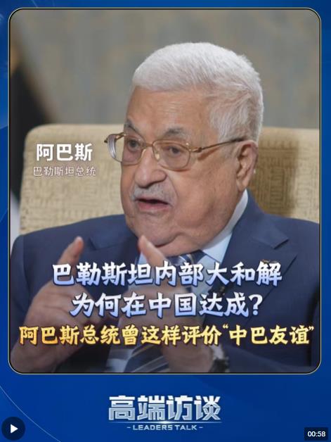 7月23日,巴勒斯坦各派在北京簽署了《關(guān)于結(jié)束分裂加強(qiáng)巴勒斯坦民族團(tuán)結(jié)的北京宣言》。巴勒斯坦內(nèi)部大和解,為何是在中國(guó)?巴勒斯坦總統(tǒng)阿巴斯接受總臺(tái)《高端訪談》專訪時(shí)曾這樣評(píng)價(jià)中巴友誼,來(lái)聽聽他怎么說(shuō)。