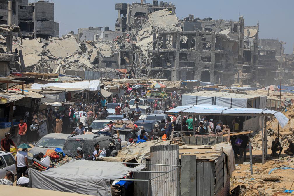 7月22日,在加沙地帶南部城市汗尤尼斯,人們逃離家園。巴勒斯坦加沙地帶衛(wèi)生部門22日說,以色列軍隊當天轟炸汗尤尼斯,造成至少70人死亡、超過200人受傷。新華社發(fā)(里澤克·阿卜杜勒賈瓦德攝)