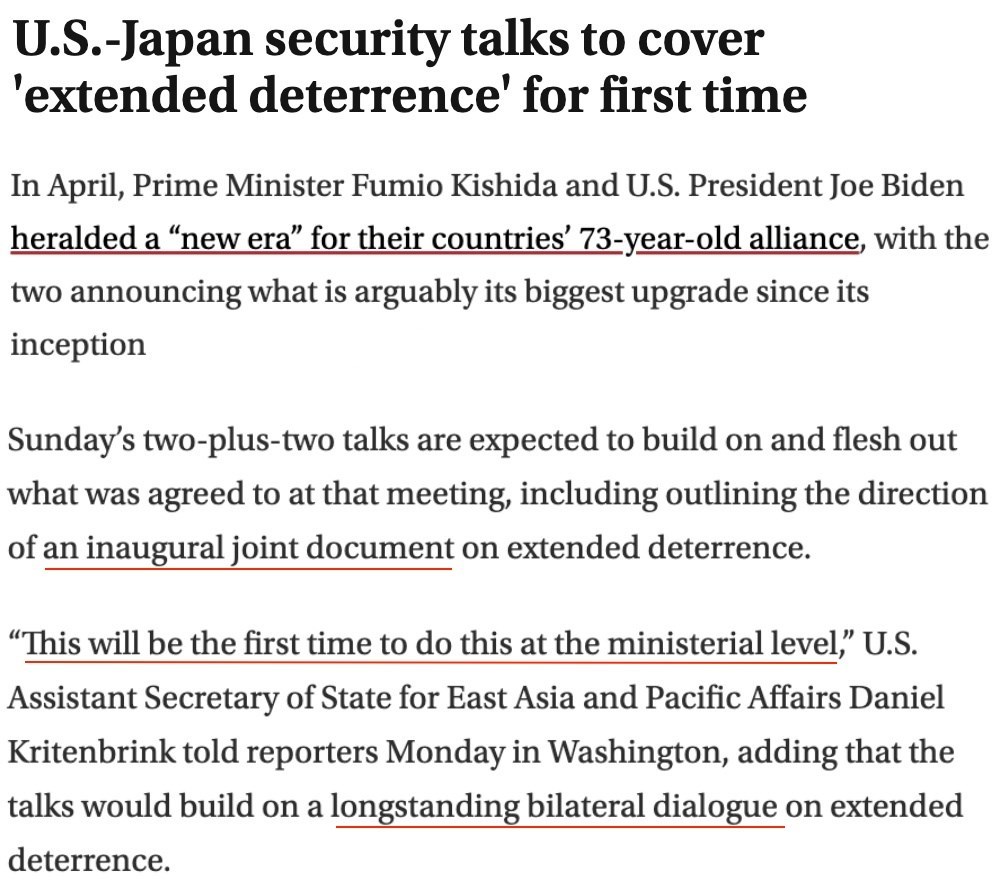 “我們對日本盟友的安全承諾是牢不可破的,我們承諾使用美國可以使用的一切手段,包括核武器,以確保我們履行這些承諾?!?/p>
