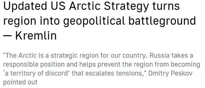 在被問及對(duì)美國這份北極戰(zhàn)略報(bào)告的看法時(shí),俄羅斯總統(tǒng)新聞秘書佩斯科夫指出,美方報(bào)告顯示出對(duì)抗色彩,而俄羅斯一直在北極問題上采取負(fù)責(zé)任的立場(chǎng),"為確保北極不會(huì)成為紛爭(zhēng)和局勢(shì)緊張地區(qū)做出貢獻(xiàn)"。