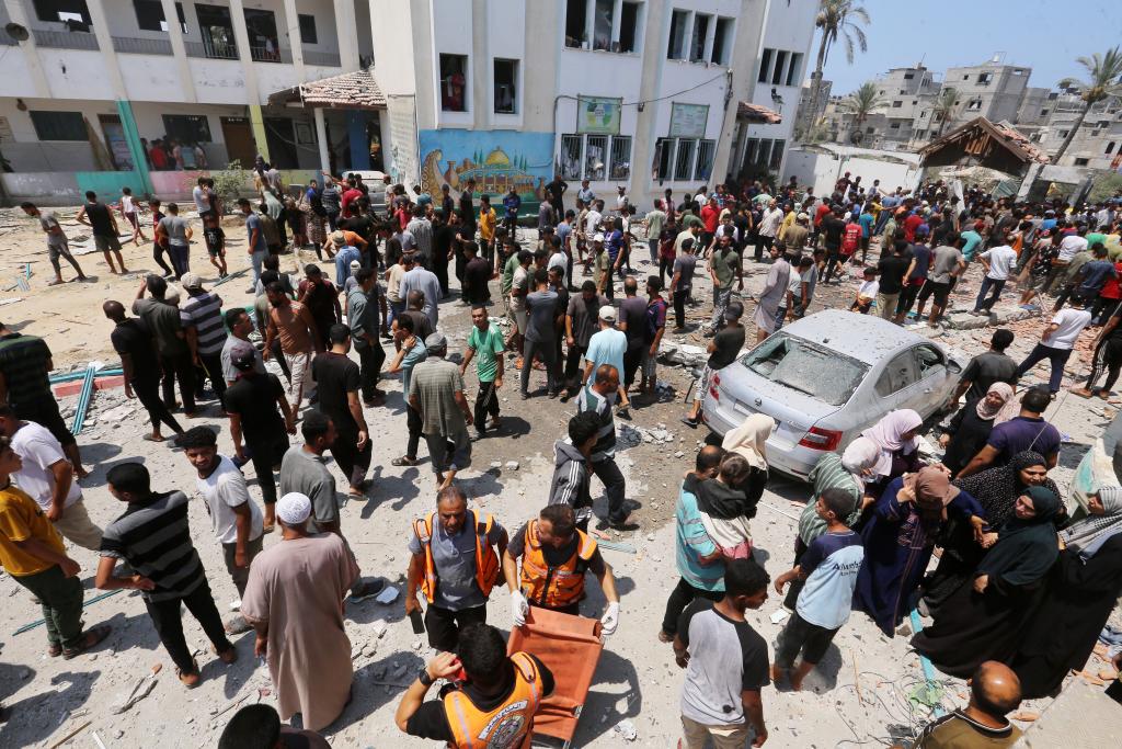 7月27日,巴勒斯坦加沙地帶衛(wèi)生部門(mén)發(fā)表聲明說(shuō),以色列軍隊(duì)當(dāng)天轟炸加沙地帶中部代爾拜拉赫一家野戰(zhàn)醫(yī)院,造成至少30人死亡、超過(guò)100人受傷。圖為人們聚集在以軍襲擊現(xiàn)場(chǎng)附近。新華社發(fā)(里澤克·阿卜杜勒賈瓦德攝)
