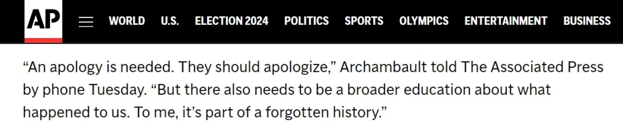 “道歉是必要的,他們應(yīng)該道歉。而我們也需要對(duì)發(fā)生在我們身上的事情進(jìn)行更廣泛的教育。對(duì)我來(lái)說(shuō),這是一段被遺忘的歷史?!?/p>
