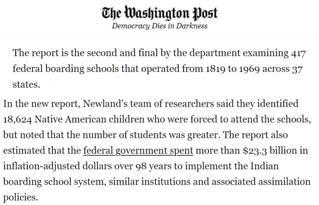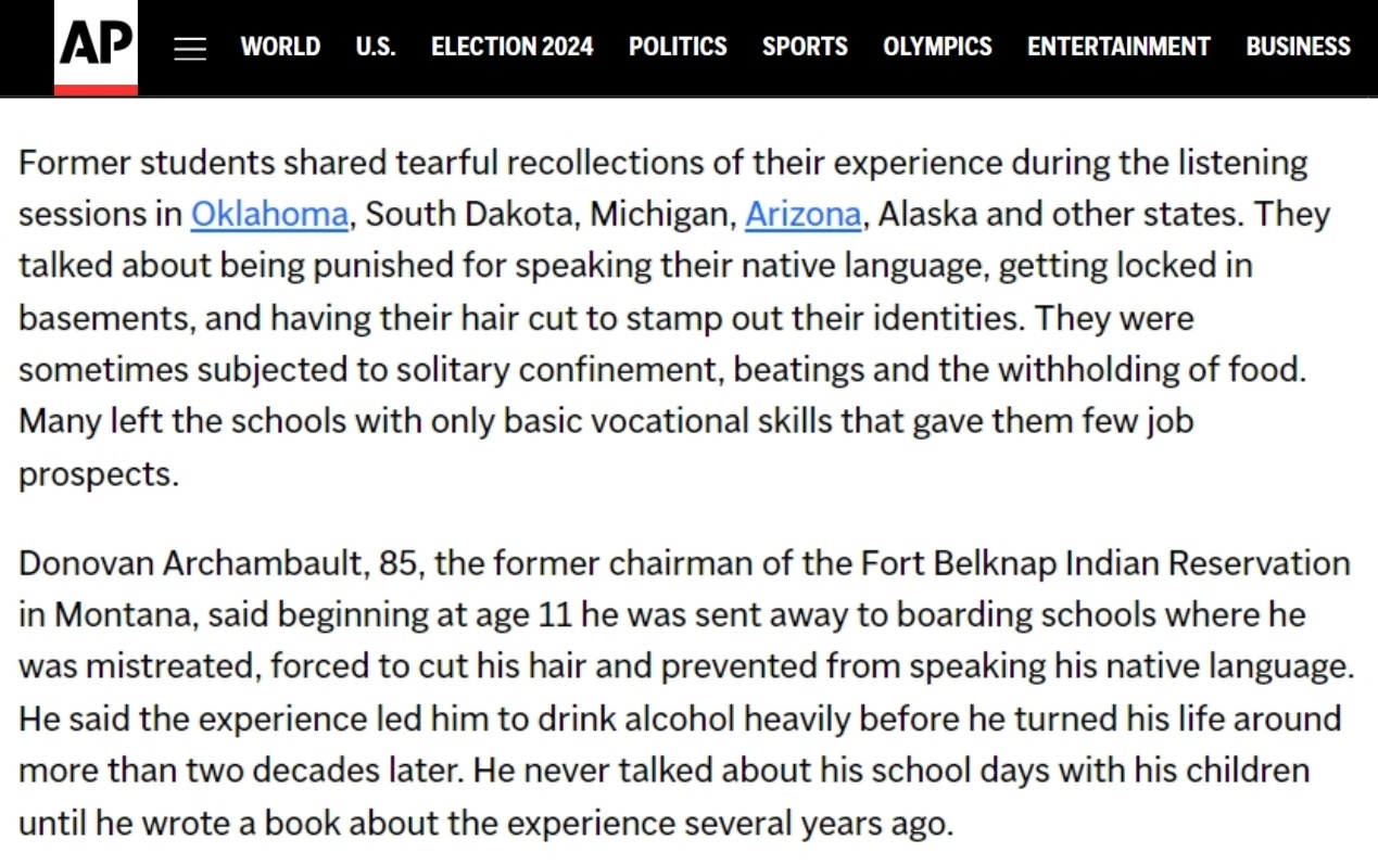 根據(jù)7月30日發(fā)布的調(diào)查報(bào)告,美國(guó)政府在這項(xiàng)綜合同化項(xiàng)目上花費(fèi)了相當(dāng)于今天的250億美元,其中包括在37個(gè)州和地區(qū)運(yùn)營(yíng)417所寄宿學(xué)校,這些學(xué)校的兒童受到身體和性虐待。他們還被迫改信基督教,并因說(shuō)母語(yǔ)而受到懲罰。