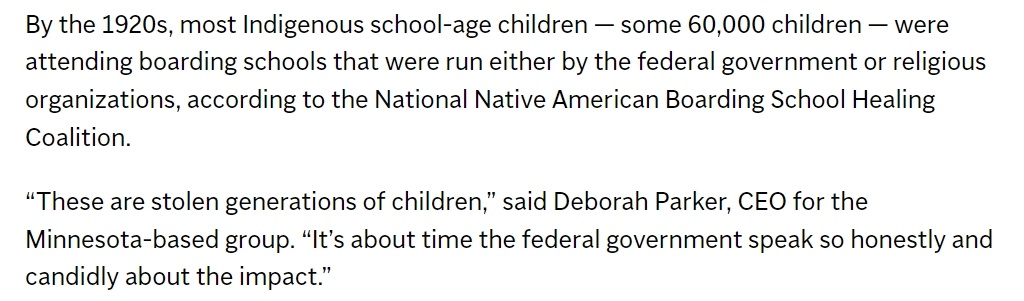 美國(guó)首位原住民出身的內(nèi)政部長(zhǎng)德布·哈蘭也說(shuō),她自己的祖父母在8歲時(shí)被“從父母、文化和社區(qū)中偷走”,被迫住在一所天主教寄宿學(xué)校,直到13歲。還有一些被偷到寄宿學(xué)校的孩子年僅4歲。