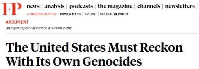 美國(guó)《外交政策》雜志曾發(fā)文說(shuō),雖然讓美國(guó)認(rèn)真對(duì)待自己的歷史是一項(xiàng)充滿政治風(fēng)險(xiǎn)的任務(wù),但即使美國(guó)自己拒絕“照鏡子”,其罪行也早已被其他人看得清清楚楚。文章敦促美國(guó)正視對(duì)原住民犯下的種族滅絕罪行,撕開所謂“完美美國(guó)”的假象。
