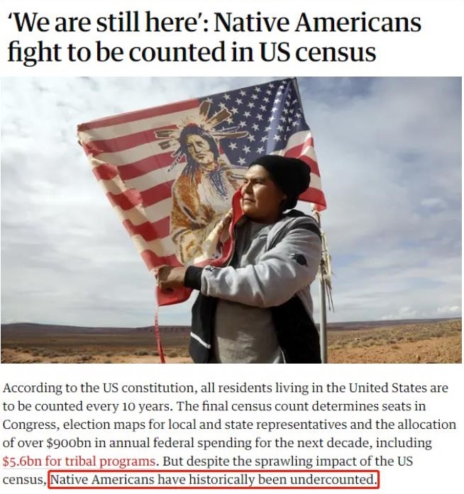 美國(guó)每十年統(tǒng)計(jì)一次居民人數(shù),最終人口普查結(jié)果決定了國(guó)會(huì)、州和地方的議席分配以及相應(yīng)的聯(lián)邦財(cái)政支出分配。但在這一過(guò)程中,美國(guó)原住民一直被忽視。