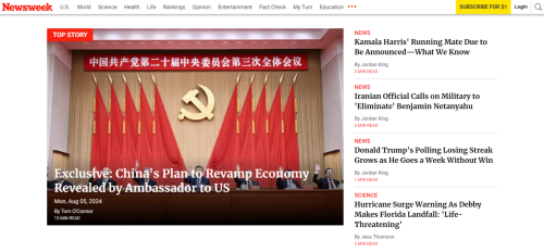 2024年8月2日,駐美國大使謝鋒接受美國《新聞周刊》(Newsweek)高級外交政策記者湯姆·奧康納專訪,闡釋中國共產(chǎn)黨二十屆三中全會精神。訪談內(nèi)容8月5日在該周刊網(wǎng)站頭版頭條刊登。主要內(nèi)容如下: