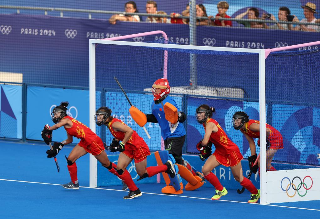8月7日,中國女子曲棍球隊(duì)球員在比賽中防守短角球。新華社記者 任鵬飛 攝