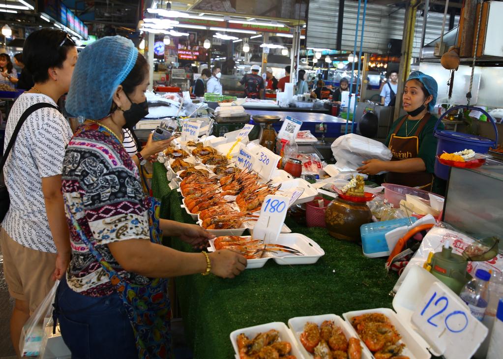 6月22日,人們?cè)谖挥谔﹪?guó)曼谷的吞武里海鮮市場(chǎng)選購(gòu)海鮮。新華社記者孫瑋彤?dāng)z