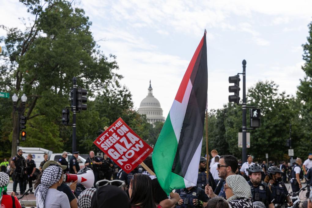 7月24日,以色列總理內塔尼亞胡在美國國會發(fā)表演講,數以千計的抗議者在國會大廈外對此表示抵制。圖為抗議者在美國國會附近的聯(lián)合車站聚集。新華社記者胡友松攝