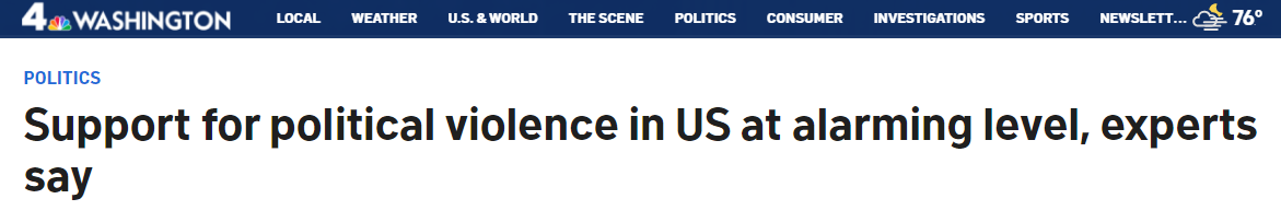 另外,美國國家廣播公司華盛頓地方頻道(NBC Washington)日前報道稱,盡管美國支持政治暴力的人與去年相比略有減少,但暴力支持者現(xiàn)在更傾向使用槍支來實現(xiàn)他們的目的。數(shù)月來,專家們始終表示,美國對出于政治動機的暴力的支持度達到了令人十分擔(dān)憂的水平。