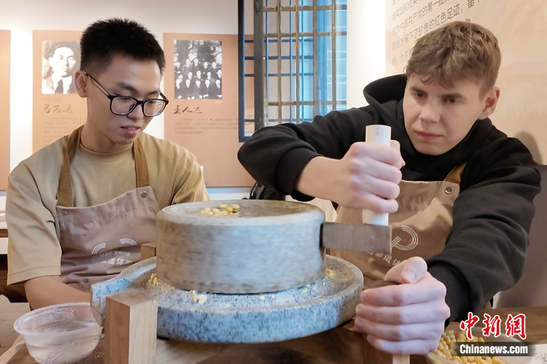 “洋弟子”體驗豆腐制作。 張子怡 攝