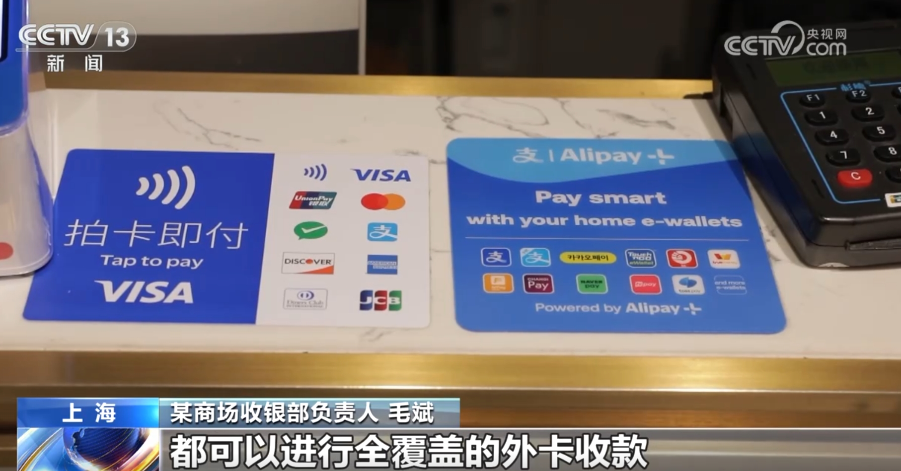 某商場收銀部負(fù)責(zé)人毛斌稱:“外國顧客到我們商場購物越來越多了,所以我們針對外國顧客的付款方式進(jìn)行了收銀方面的調(diào)整改進(jìn),目前商場所有的收銀設(shè)備都可以進(jìn)行全覆蓋的外卡收款?!?/p>