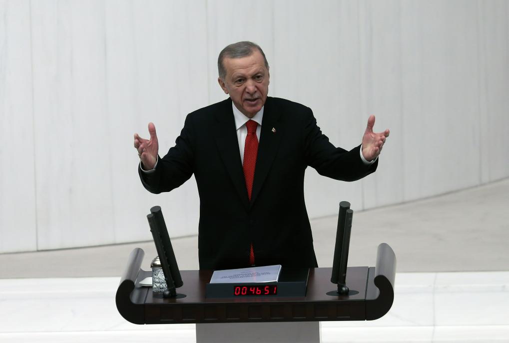 2023年10月1日,在土耳其安卡拉,土耳其總統(tǒng)埃爾多安在議會(huì)發(fā)表講話(huà)。新華社發(fā)(穆斯塔法·卡亞攝)