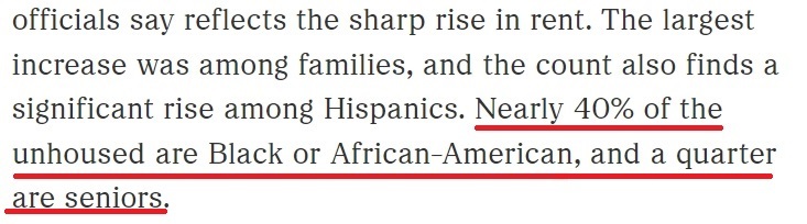 根據(jù)美國全國公共廣播電臺(tái)2023年報(bào)道中提及的數(shù)據(jù),近40%的無家可歸者是非洲裔美國人,25%的無家可歸者是老年人,而拉丁裔無家可歸者的增幅則在近年大幅提升。