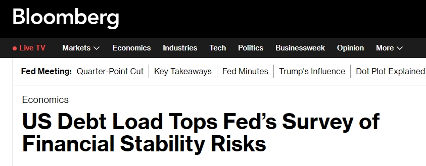 彭博社(Bloomberg)在報(bào)道中提到,美國(guó)政府的債務(wù)負(fù)擔(dān)現(xiàn)在被認(rèn)為是金融穩(wěn)定面臨的最大風(fēng)險(xiǎn),在美聯(lián)儲(chǔ)的一項(xiàng)調(diào)查中,其重要性超過(guò)了持續(xù)的通貨膨脹。逾半數(shù)受訪者(54%)認(rèn)為美國(guó)財(cái)政債務(wù)的可持續(xù)性是一個(gè)突出風(fēng)險(xiǎn),而半年前這一比例僅為40%。美聯(lián)儲(chǔ)的半年度金融穩(wěn)定報(bào)告寫道:“美國(guó)財(cái)政債務(wù)可持續(xù)性方面的擔(dān)憂位居榜首,其次是中東緊張局勢(shì)升級(jí)和政策的不確定性?!?/p>