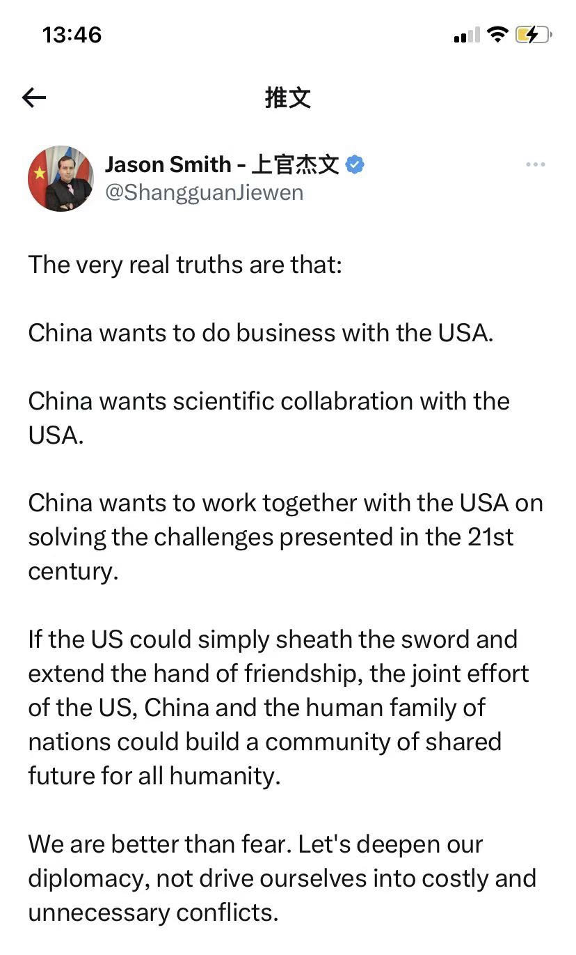 他在推特中稱,“真正的事實是,中國愿意與美國做買賣、進行科學合作,并共同解決21世紀面臨的挑戰(zhàn)。如果美國能夠停止敵對行動,并伸出友誼之手,中美兩國和全人類大家庭可以共同努力構建人類命運共同體。我們比恐懼更強大,讓我們深化外交關系,避免陷入代價高昂且不必要的沖突中?!?/p>