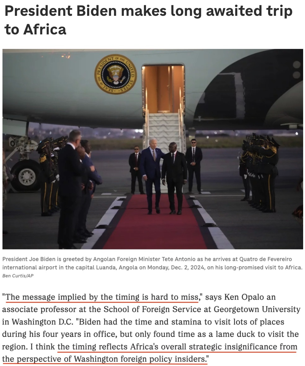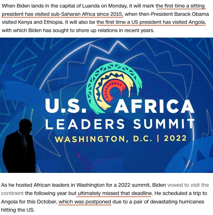 △美國有線電視新聞網(wǎng)報道:這是一場拖了太久的訪問。2022年在華盛頓舉行的美非峰會上,拜登曾承諾2023年訪問非洲,但他食言了。即便是這次原本安排在10月的安哥拉之行也因美國國內(nèi)發(fā)生颶風(fēng)災(zāi)害而推遲。