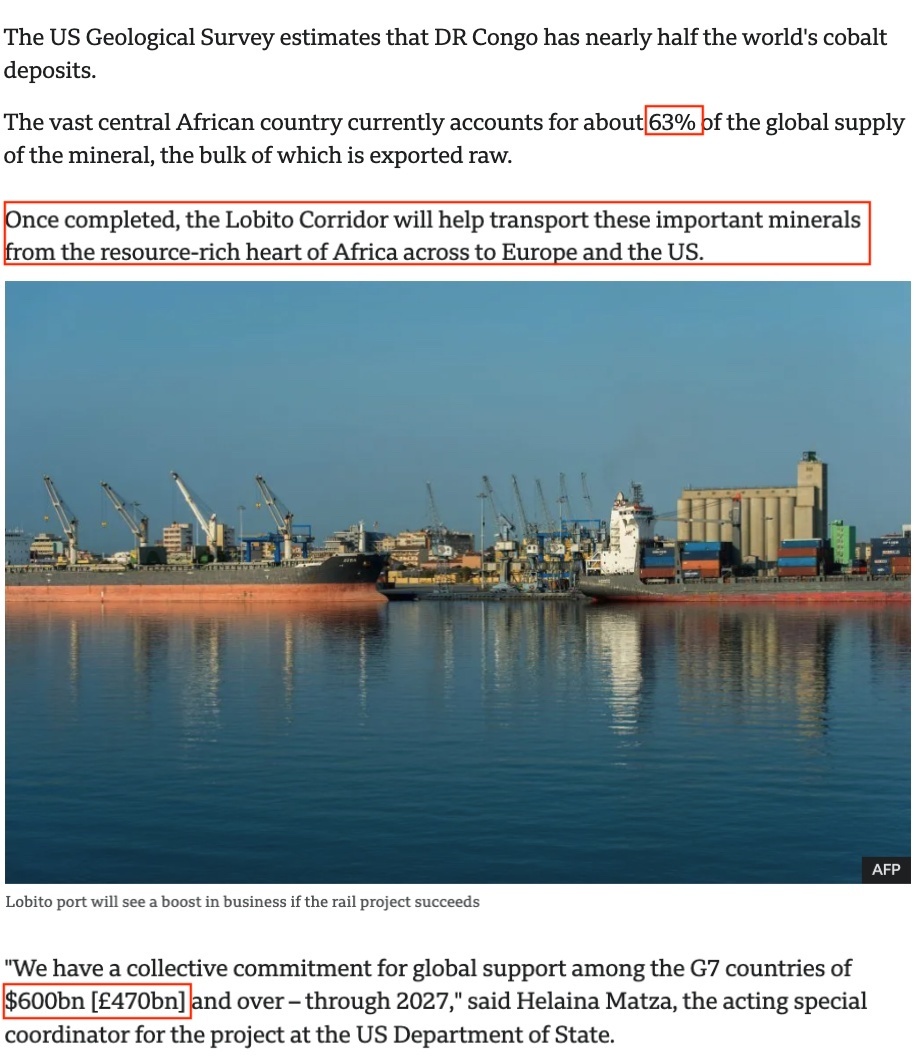 “洛比托走廊”是剛果(金)、贊比亞和安哥拉這三個非洲國家以及美國、其他七國集團(G7)成員國和私人投資者之間的一個聯(lián)合項目。這條全長1344公里的鐵路線將剛果(金)的鈷、鋰和銅礦以及贊比亞的銅帶地區(qū)連接到安哥拉的大西洋港口城市洛比托。