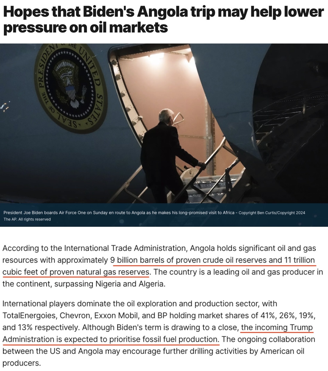 雖然拜登的任期即將結(jié)束,但預(yù)計即將上任的特朗普政府將優(yōu)先考慮化石燃料生產(chǎn)。美國和安哥拉之間正在進行的合作可能會鼓勵美國石油生產(chǎn)商進一步開展鉆探活動。