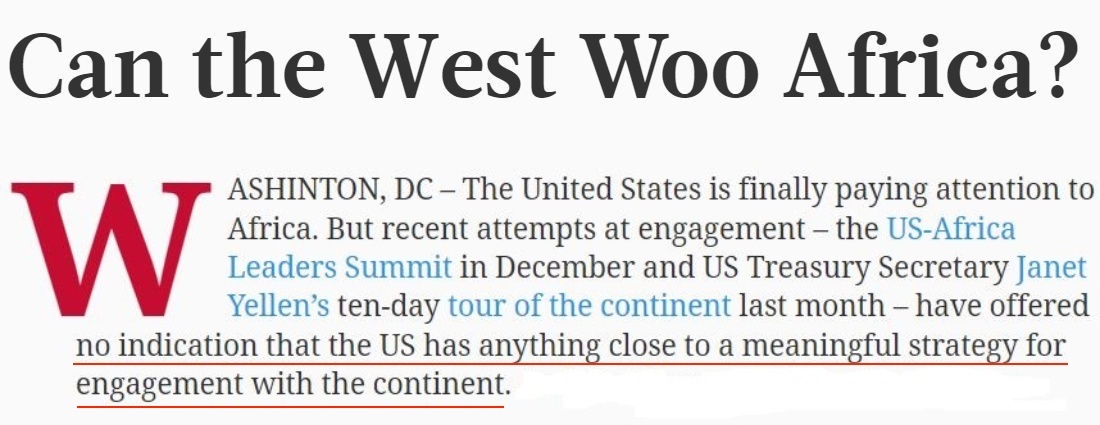 △世界報業(yè)辛迪加網(wǎng)站:雖然非洲以其快速增長的人口、豐富的資源以及龐大的聯(lián)合國會員國席位數(shù)目重新受到了美國的關(guān)注,但沒有任何跡象表明美國已制定出與非洲加強接觸的有意義的戰(zhàn)略。