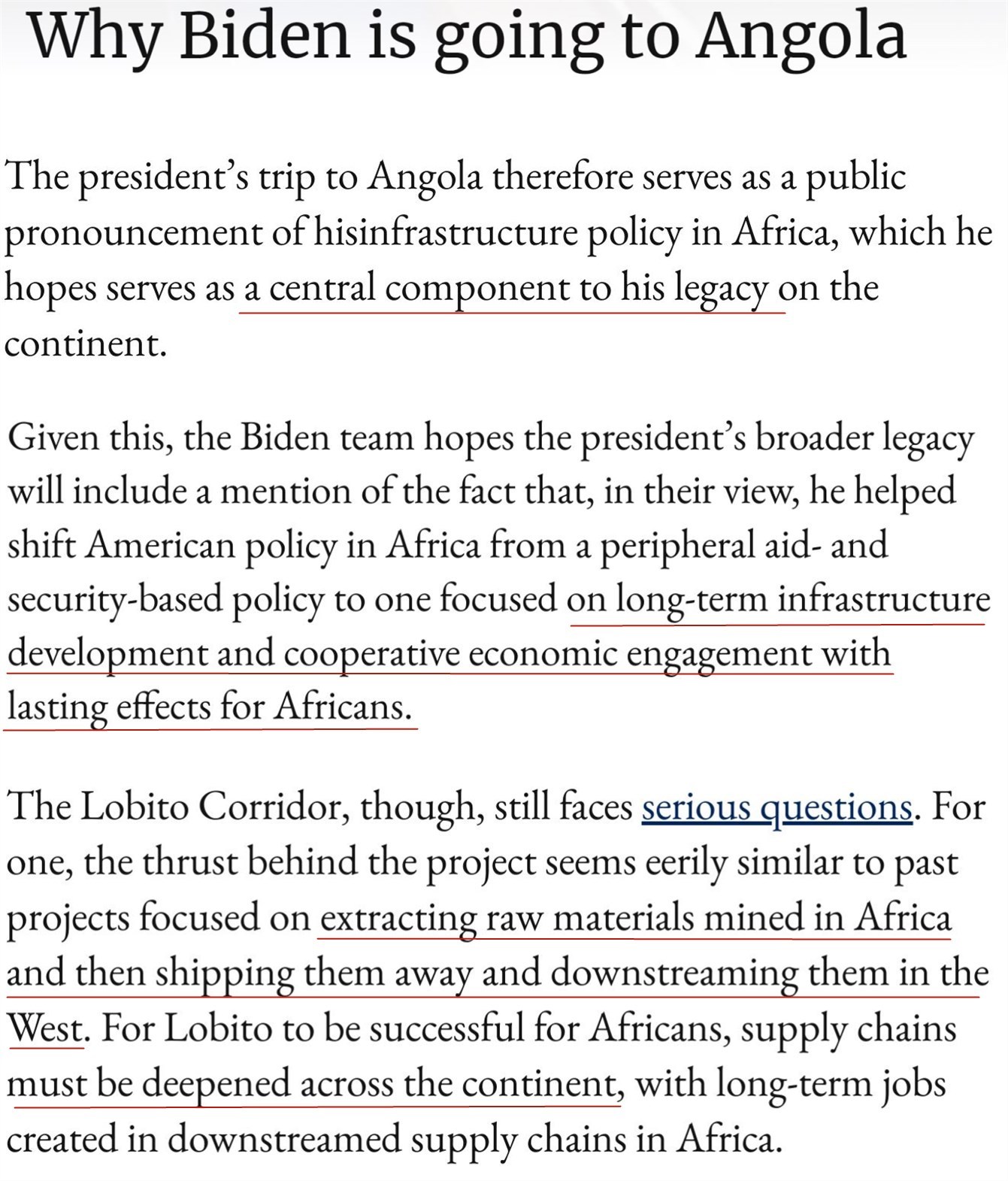 《紐約時報》日前刊文稱,拜登此訪重點推廣的“洛比托走廊”項目,將鼓勵私人投資參與項目,因為美國只提供部分資金。沒人知道建成這條“走廊”需要多長時間,也不知道安哥拉人什么時候能看到好處。一些人對這些好處能否實現(xiàn)持懷疑態(tài)度。