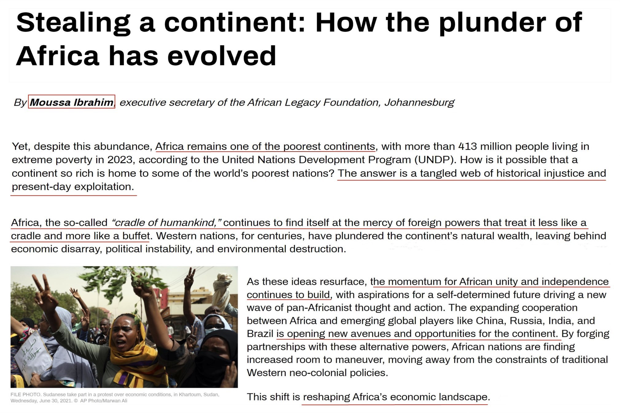 非洲遺產(chǎn)基金會執(zhí)行秘書穆薩·易卜拉欣發(fā)文指出,盡管非洲自然資源豐富,但仍是最貧窮的大陸。時至今日,非洲這個人類搖籃仍受到外國列強的擺布,西方對非洲自然資源的劫掠只不過換了包裝。