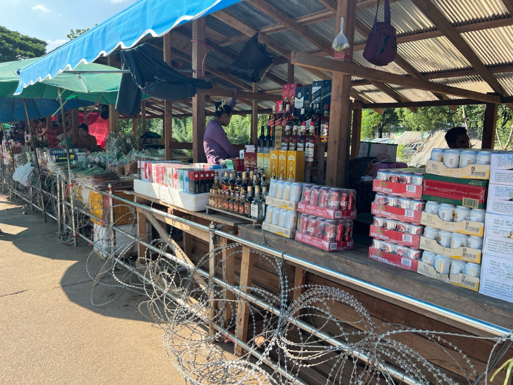2023年11月27日,在泰國湄索,緬甸商戶隔著鐵絲網(wǎng)售賣商品。(新華社記者林昊攝)