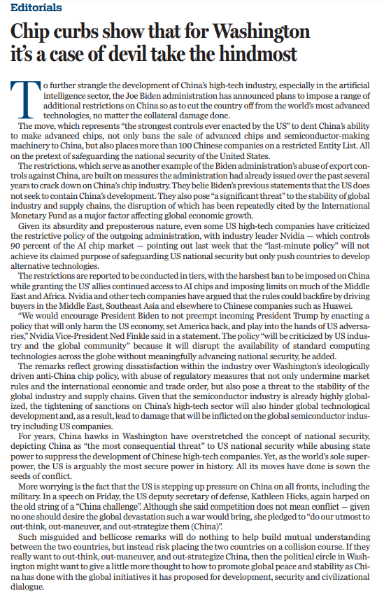 1月13日,拜登政府在卸任前夕出臺(tái)人工智能相關(guān)出口管制措施,進(jìn)一步加嚴(yán)對(duì)人工智能芯片、模型參數(shù)等出口管制,還拓展了長臂管轄,對(duì)第三方與中國開展正常貿(mào)易設(shè)置障礙、橫加干涉。拜登政府的這一舉措完全無視后果,旨在進(jìn)一步遏制中國高科技產(chǎn)業(yè),尤其是人工智能領(lǐng)域的發(fā)展。