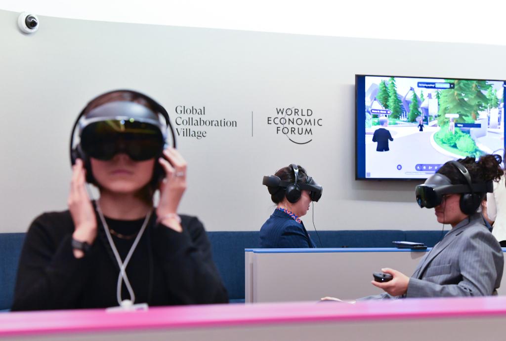 1月23日,在瑞士達(dá)沃斯,與會(huì)者借助VR設(shè)備沉浸式參加世界經(jīng)濟(jì)論壇2025年年會(huì)。新華社記者連漪攝