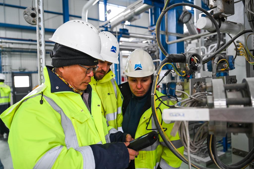2月12日,中土兩國(guó)工程師在土耳其阿克薩拉伊省的圖茲湖地下天然氣儲(chǔ)庫擴(kuò)建項(xiàng)目地面場(chǎng)站查看設(shè)備。新華社記者劉磊攝