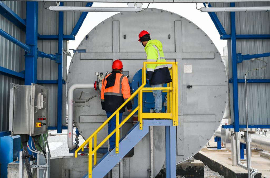 2月12日,中國(guó)工作人員在土耳其阿克薩拉伊省的圖茲湖地下天然氣儲(chǔ)庫擴(kuò)建項(xiàng)目地面場(chǎng)站查看設(shè)備。新華社記者劉磊攝