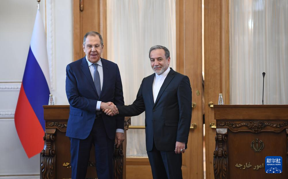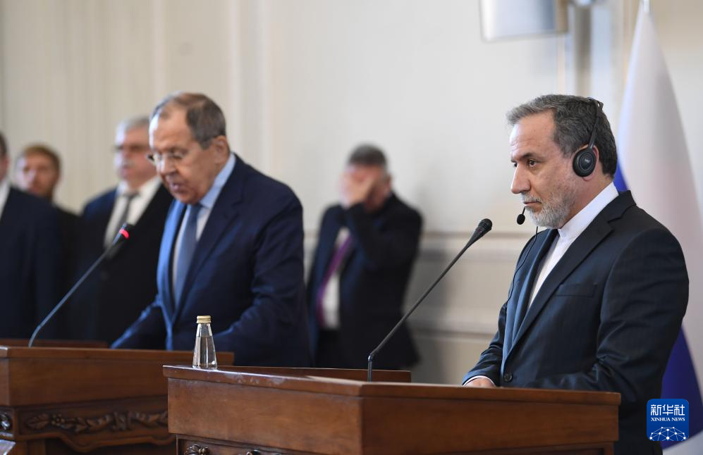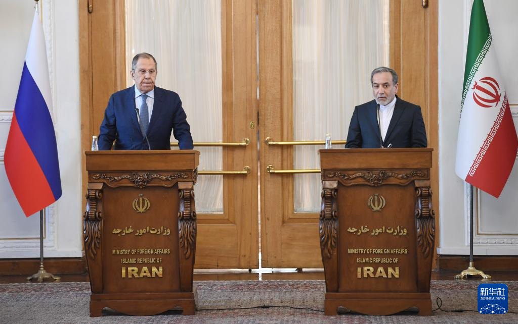 2月25日,在伊朗德黑蘭,伊朗外交部長阿拉格齊(右)與俄羅斯外長拉夫羅夫出席聯(lián)合新聞發(fā)布會。新華社記者 沙達(dá)提 攝
