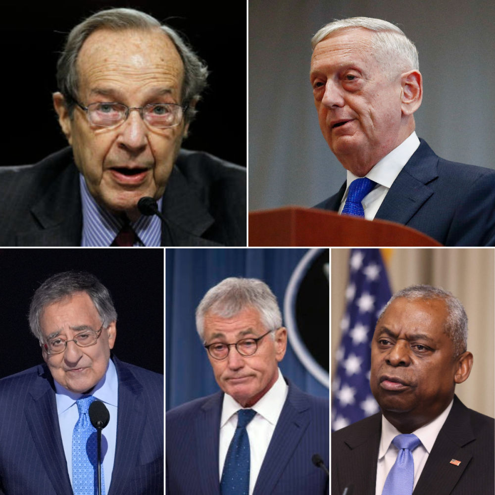 拼版照片,圖為美國前國防部長佩里(上左)、馬蒂斯(上右)、帕內(nèi)塔(下左)、哈格爾(下中)和奧斯汀。圖片源自網(wǎng)絡