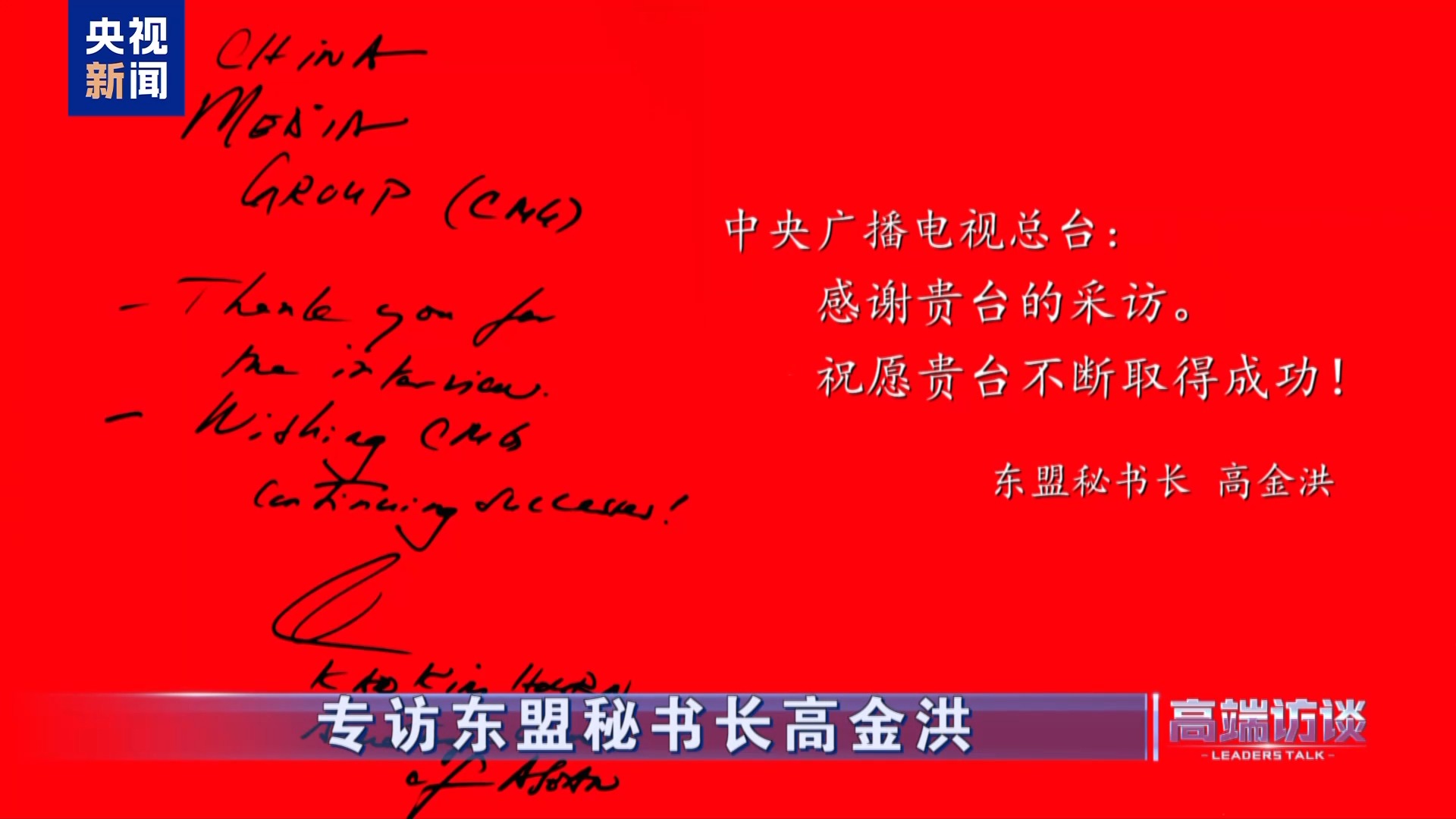 東盟秘書長(zhǎng)高金洪在接受總臺(tái)專訪后題詞——中央廣播電視總臺(tái):感謝貴臺(tái)的采訪。祝愿貴臺(tái)不斷取得成功!