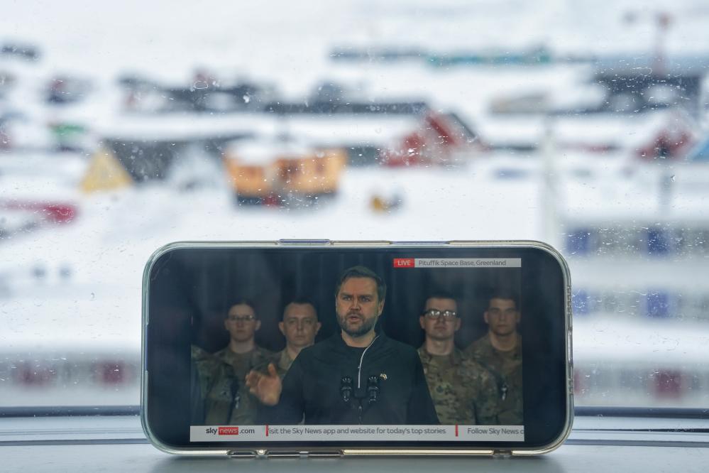 這是3月28日在丹麥自治領(lǐng)地格陵蘭島首府努克拍攝的美國(guó)副總統(tǒng)萬(wàn)斯講話的直播畫(huà)面。新華社記者彭子洋攝