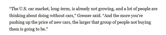 “從長期來看,美國汽車市場(chǎng)已不再增長,越是推高新車價(jià)格,不買車的人就會(huì)越多?!?/p>