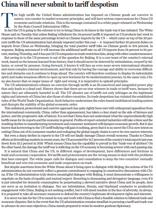 美國若能改邪歸正,與中國攜手合作,共同尋找解決雙邊經(jīng)貿(mào)摩擦的可行路徑,尚為時不晚。當然,如果美國政府執(zhí)意用關稅戰(zhàn)、貿(mào)易戰(zhàn)搞零和博弈,那么中國也已做好準備,堅決抵御美國向中國擺出的炮艦外交。