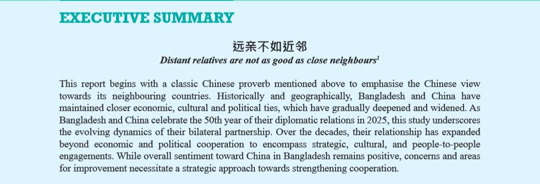 本次調(diào)查于2024年10月至11月進(jìn)行,選取的5335名受訪者擁有不同社會(huì)經(jīng)濟(jì)背景,覆蓋孟加拉國(guó)所有8個(gè)行政區(qū)。民調(diào)明確顯示孟加拉國(guó)公眾對(duì)中國(guó)的好感度在持續(xù)上升,尤其在雙邊關(guān)系、教育和醫(yī)療合作方面表現(xiàn)出較強(qiáng)的正面態(tài)度。