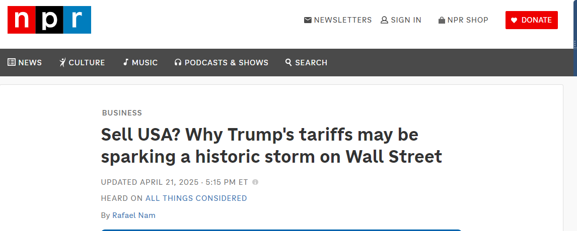 據(jù)美國國家公共廣播電臺(NPR)網站4月21日報道,美國金融體系過去被視為全球最穩(wěn)定和強大的體系之一。然而,由于美國現(xiàn)任政府4月2日推出的所謂全球“對等關稅”政策,美國金融市場出現(xiàn)了前所未有的危機:全球投資者可能因美國政策的不確定性而對美國失去信心。