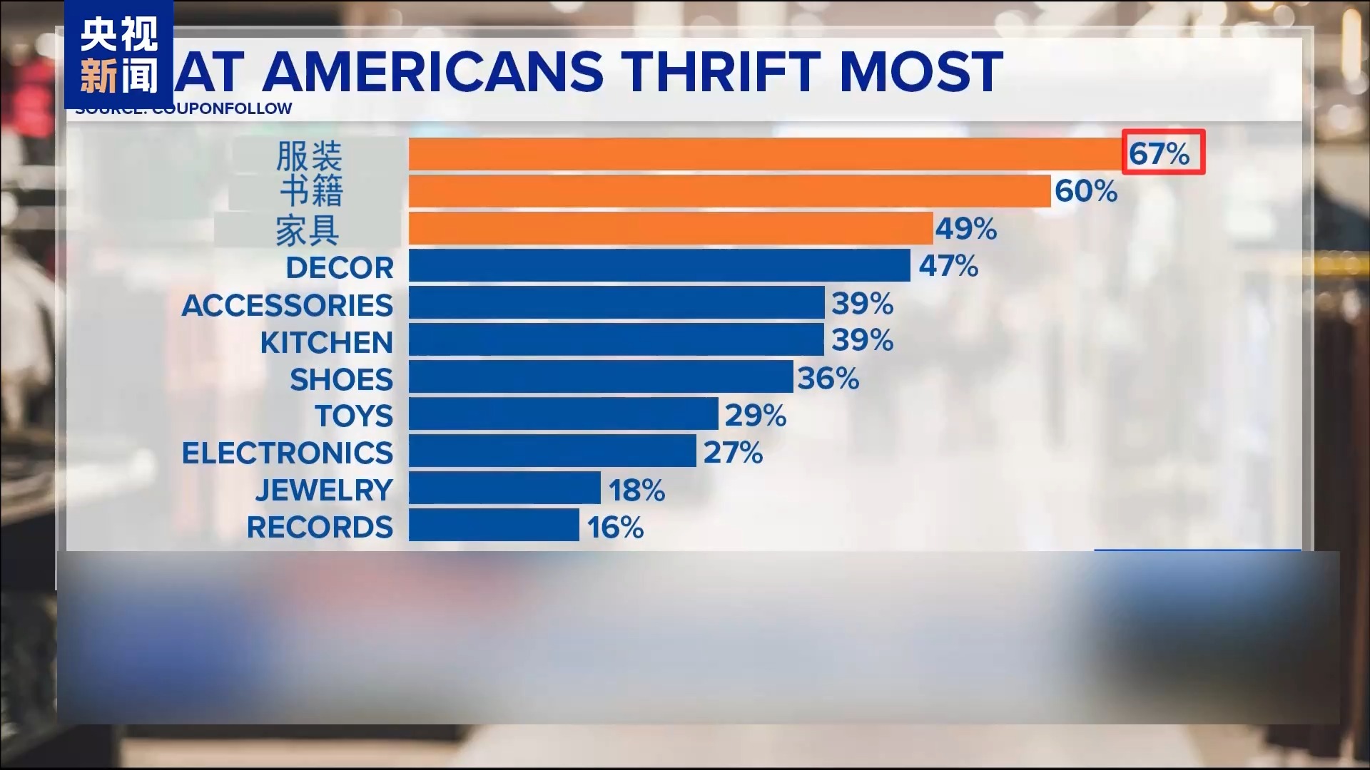 美國一家在線交易平臺(CouponFollow)的一組調查數據顯示,67%的美國消費者選擇在二手市場購買服裝,60%的人購買書籍,近50%的人購買家具。