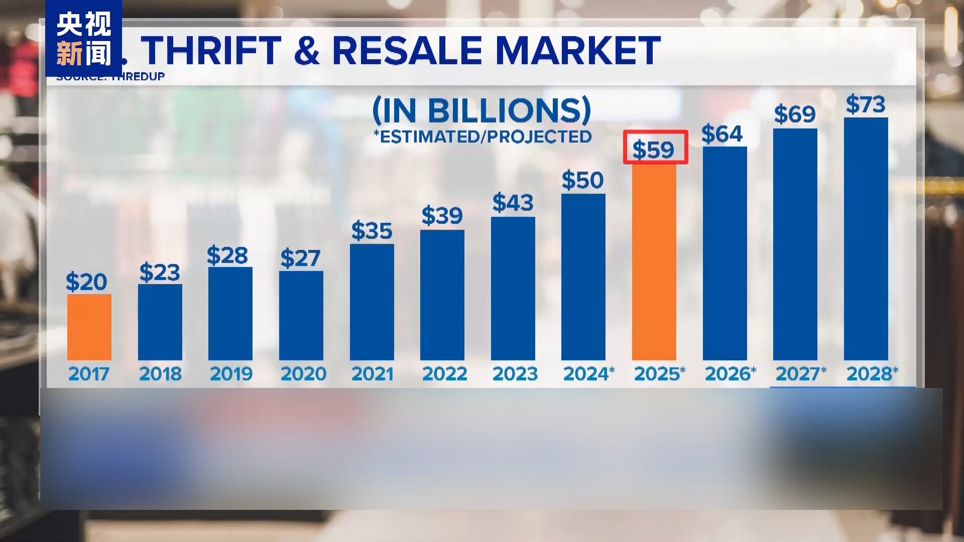 美國二手商品交易在線平臺思雷達普公司的數據顯示,2017年美國二手交易市場的價值只有200億美元。根據該公司的預測,受關稅政策影響,2025年二手交易市場價值將升至590億美元,此后也將一路飆升,照此發(fā)展2028年的價值將達到730億美元。