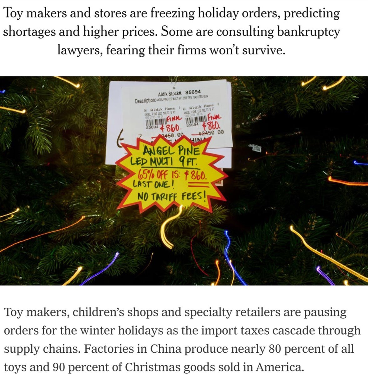 經(jīng)營(yíng)家居用品的拉里·戈?duì)柕抡f,去年一棵約2.3米高的圣誕樹在店里的價(jià)格大約是1000美元。如今他別無(wú)選擇,只能把關(guān)稅成本轉(zhuǎn)嫁給消費(fèi)者,這將使同樣的一棵樹今年的價(jià)格超過2000美元。他無(wú)奈地表示,這個(gè)價(jià)格等于“給產(chǎn)品判了死刑”。