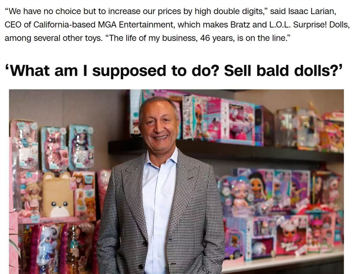 以玩具行業(yè)為例,代表全美850多家玩具制造商的玩具協(xié)會(huì)首席執(zhí)行官格雷格·阿赫恩對(duì)媒體直言,美國(guó)玩具行業(yè)高達(dá)96%的制造商和公司都是中小企業(yè),在現(xiàn)行的關(guān)稅稅率下,它們冒不起風(fēng)險(xiǎn)。